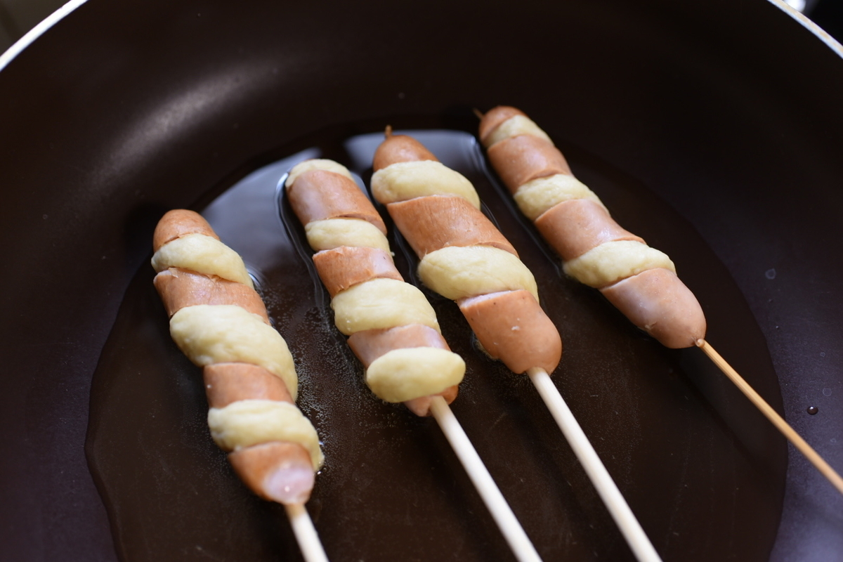 3 生地をウインナーに巻いて揚げる